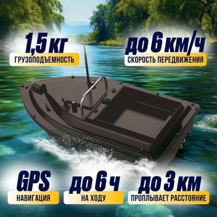 Катер оснащен мощным аккумулятором 5200 mAh, что позволяет ему быть на ходу до 4х часов, либо проплыть на расстояние до 2х км. Аккумулятор размещен в передней части корпуса корабля и имеет быстрый практичный доступ для отключения или замены. На корме судна есть светодиодная индикация заряда батареи. Дальность радиосвязи корабля составляет 500 м, благодаря этому вы сможете забросить снасти в любое место в водоеме! Скорость передвижения - до 6 км/ч. Мощные электромоторы и трёхлопастные винты делают катер очень маневренным, в следствие чего он может развернуться в радиусе 1 метр.
